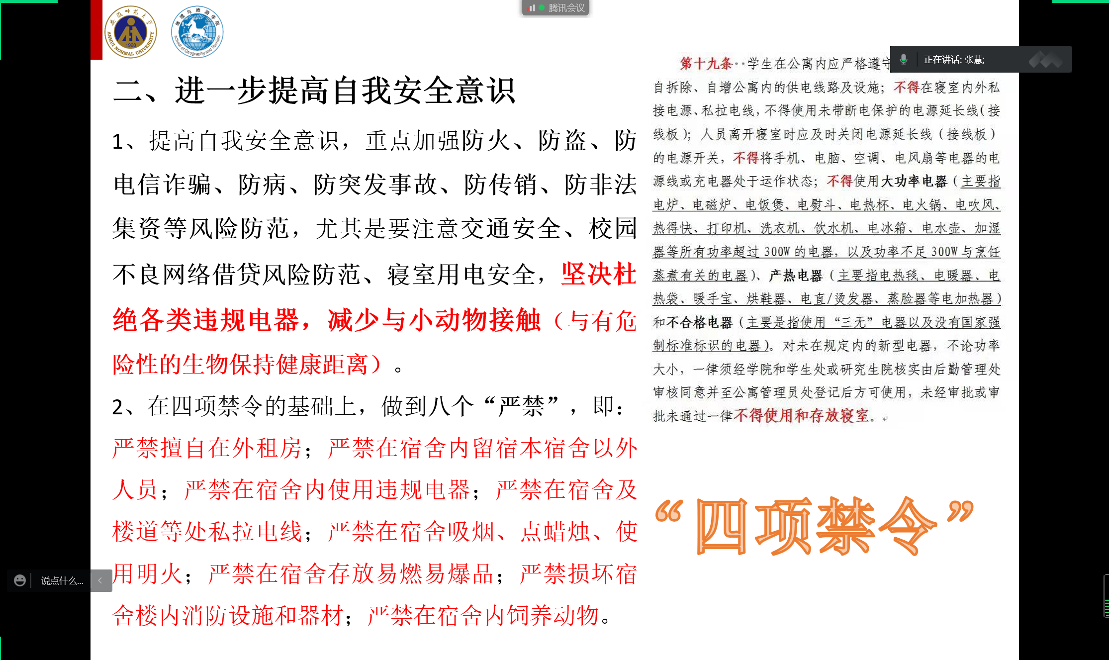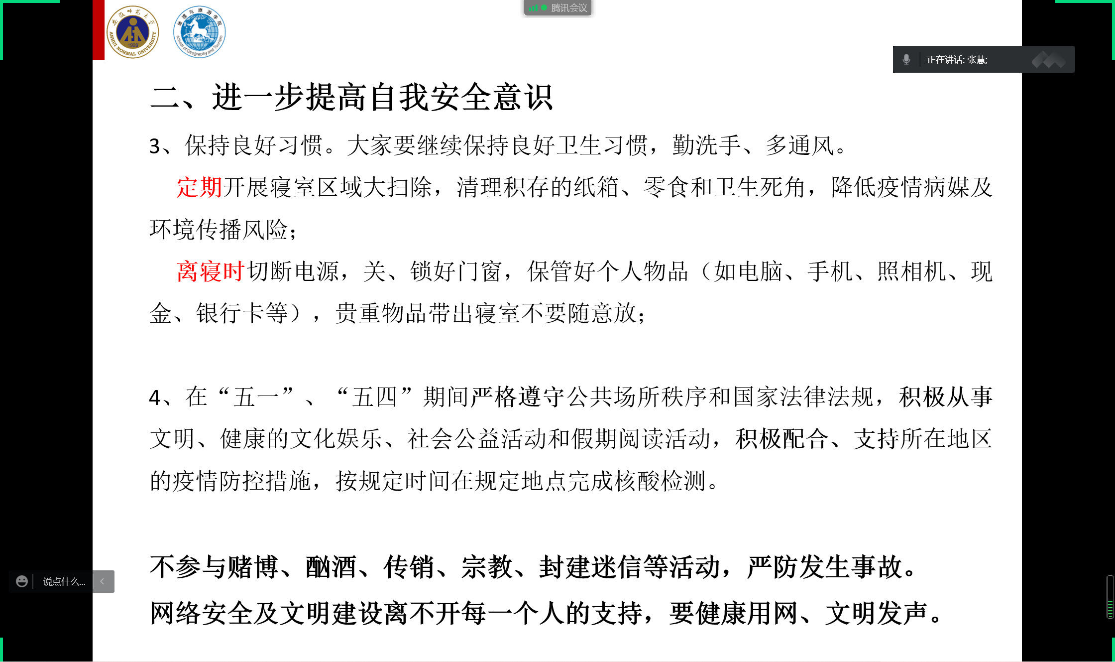 张慧还以近期社会、学校相关案例进行警示教育,号召学生进一步提高自我安全意识,重点加强防火、防盗、防电信诈骗、防病、防突发事故、防传销等风险防范,尤其是要注意交通安全、校园不良网络借贷风险防范、寝室用电安全,坚决杜绝各类违规电器,减少与小动物接触,与有危险性的生物保持健康距离。她还进一步强调了“四项禁令”和“八个严禁”,要求学生保持良好习惯,注意网络安全文明建设,不参与赌博、酗酒、传销、宗教、封建迷信等活动,严防发生事故。2018级城乡规划和地理科学(非师范)专业全体学生认真聆听,纷纷表示会遵守校规校纪,做文明的大学生。