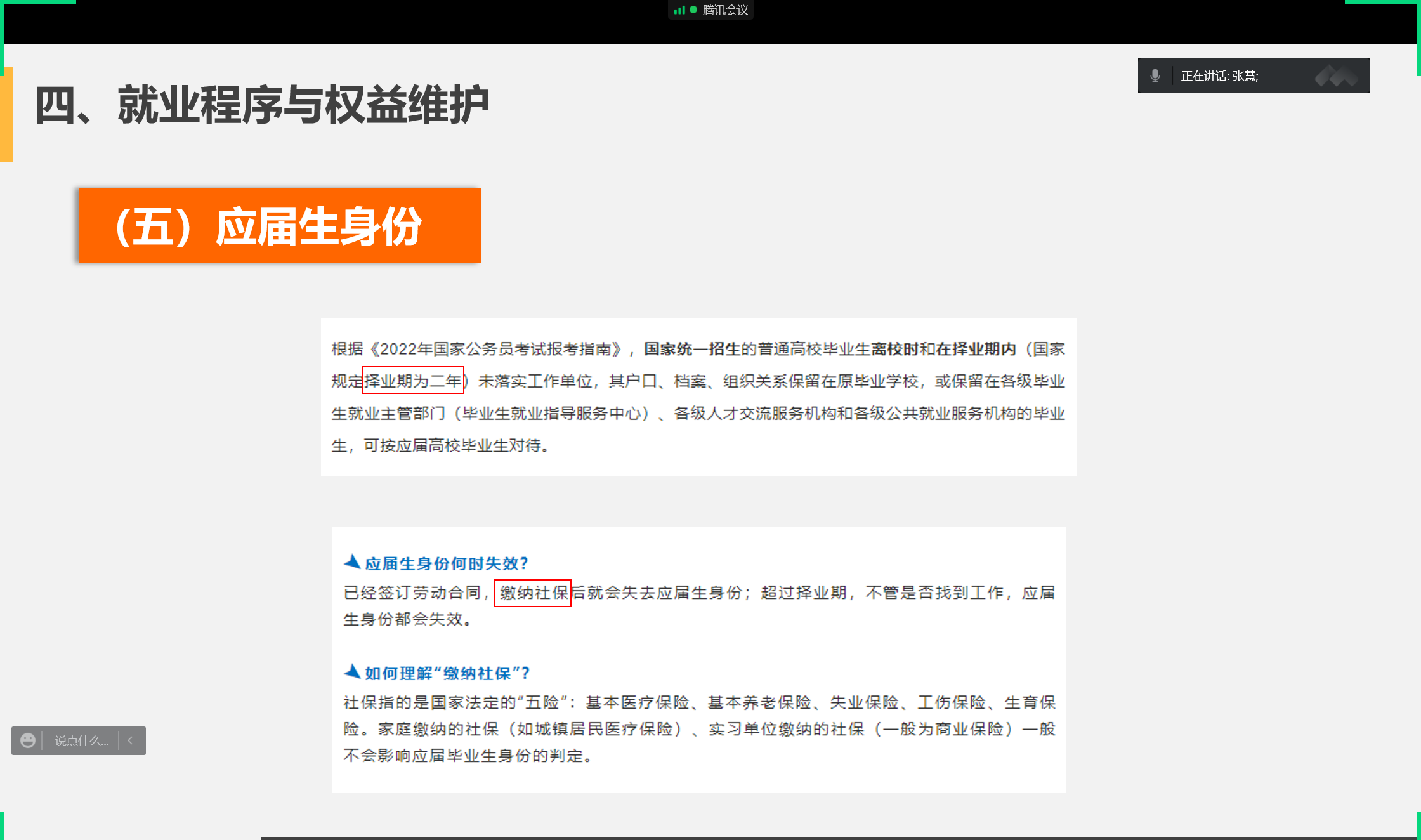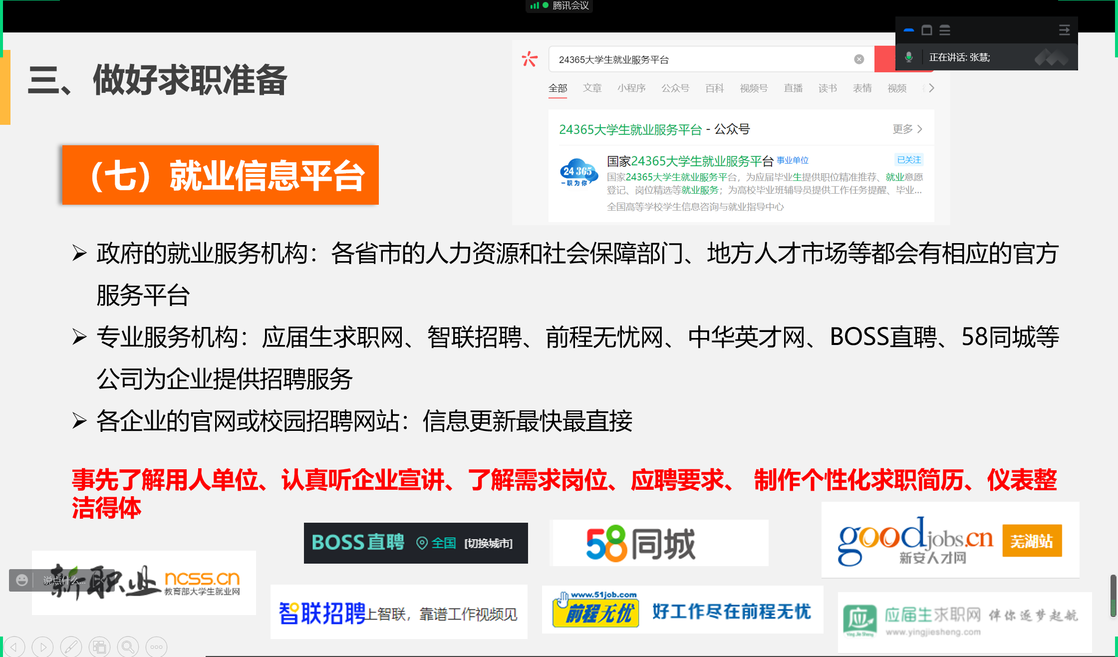 疫情期间毕业班学生求职时会遇到一些问题,张慧就近期与学生交流时发现的问题给学生进行讲解,告知学生们如何转变身份、改好简历、做好求职准备,并宣传了相关的政策以及可以用来求职的网站、微信公众号、小程序、软件等。