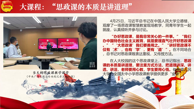 接着,刘少杰从大课程:“思政课的本质是讲道理”、大命题:回答时代之题,彰显中国之理、大先生:“经师”和“人师”相统一、大熔炉:勇当开路先锋,争当事业闯将,这四个方面带领大家深刻学习领会总书记考察中国人民大学重要讲话精神,同学们纷纷表示受益匪浅。