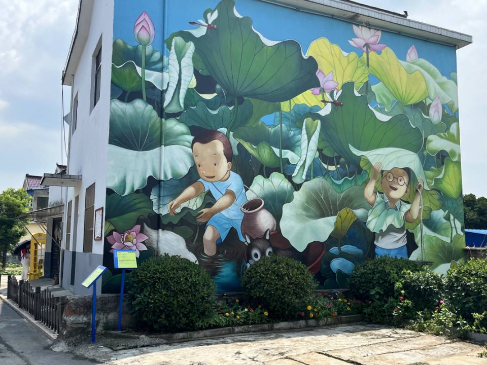 穿越石桥,沿着清澈的湖畔,实践团队欣赏了犁桥艺术图书馆、星空泡泡野奢酒店、犁桥美术馆等艺术建筑,丰富多彩的墙绘作品,独具特色的民俗建设。乡野和民房之间,也有造型各异,独具创意的雕塑作品。无论走在乡村的哪一处角落,都能感受到文化艺术的气息。独特的乡村艺术成为了出名的打卡点,吸引游客前来游玩,有效带动了犁桥村乡村旅游的发展。