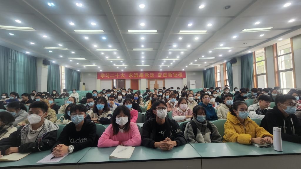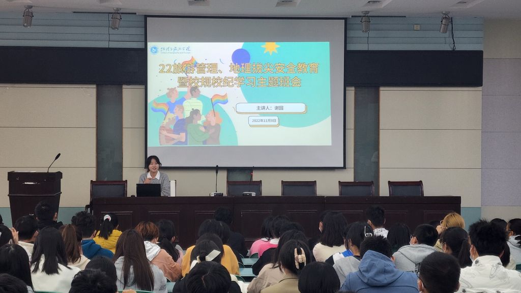 实验楼101开展安全教育暨校规校纪学习主题班会,会议由辅导员谢园主持,2022级旅游管理、地科(拔尖班)全体同学参加。