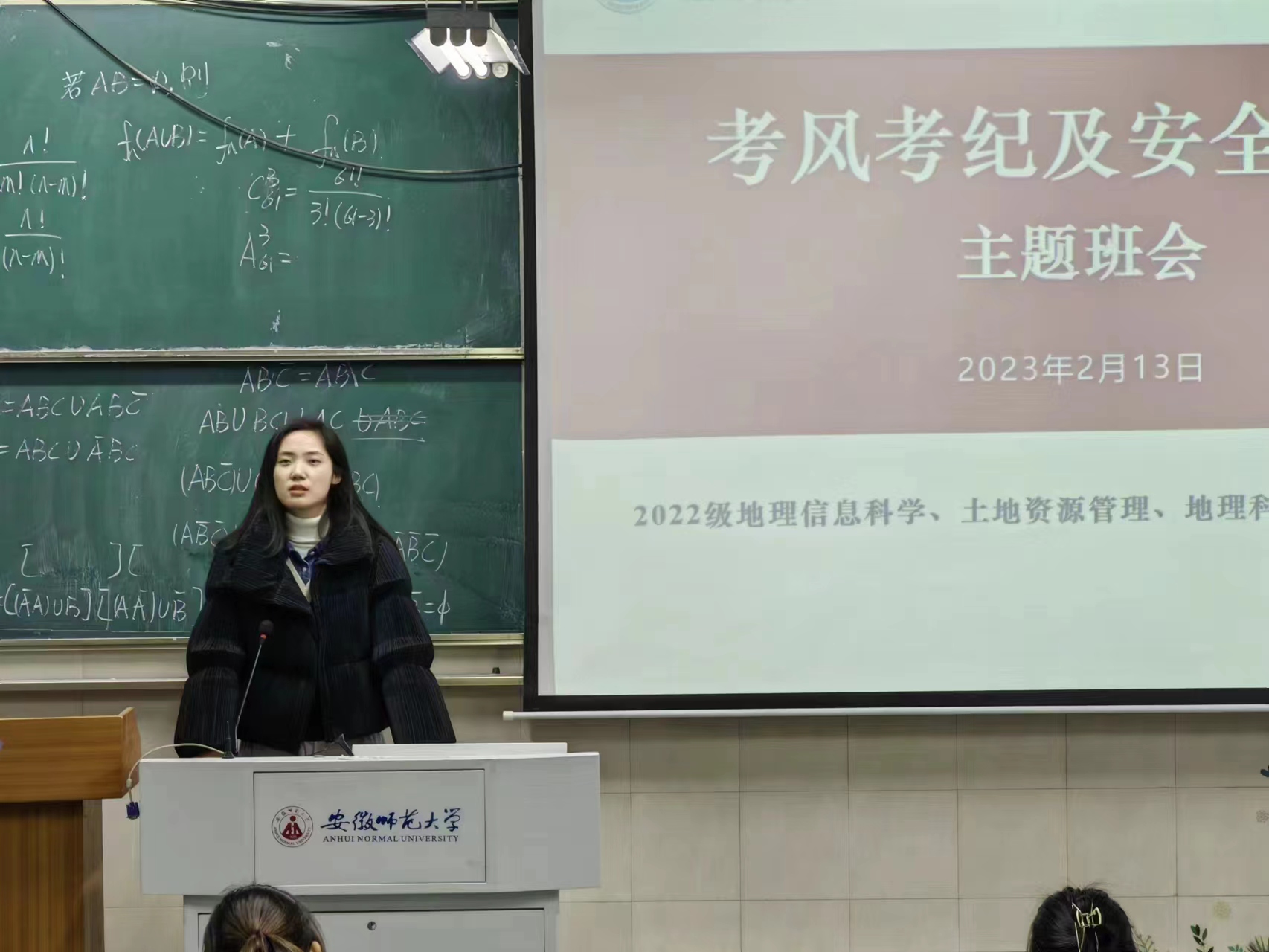 魏语菲、陈祥云)2月13日晚,2022级地理信息科学、地理科学(拔尖人才班)、土地资源管理分别于教学楼4号楼201、202、302教室举行考风考纪教育主题班会,会议由辅导员陈祥云主持,全体180名同学参与此次会议。