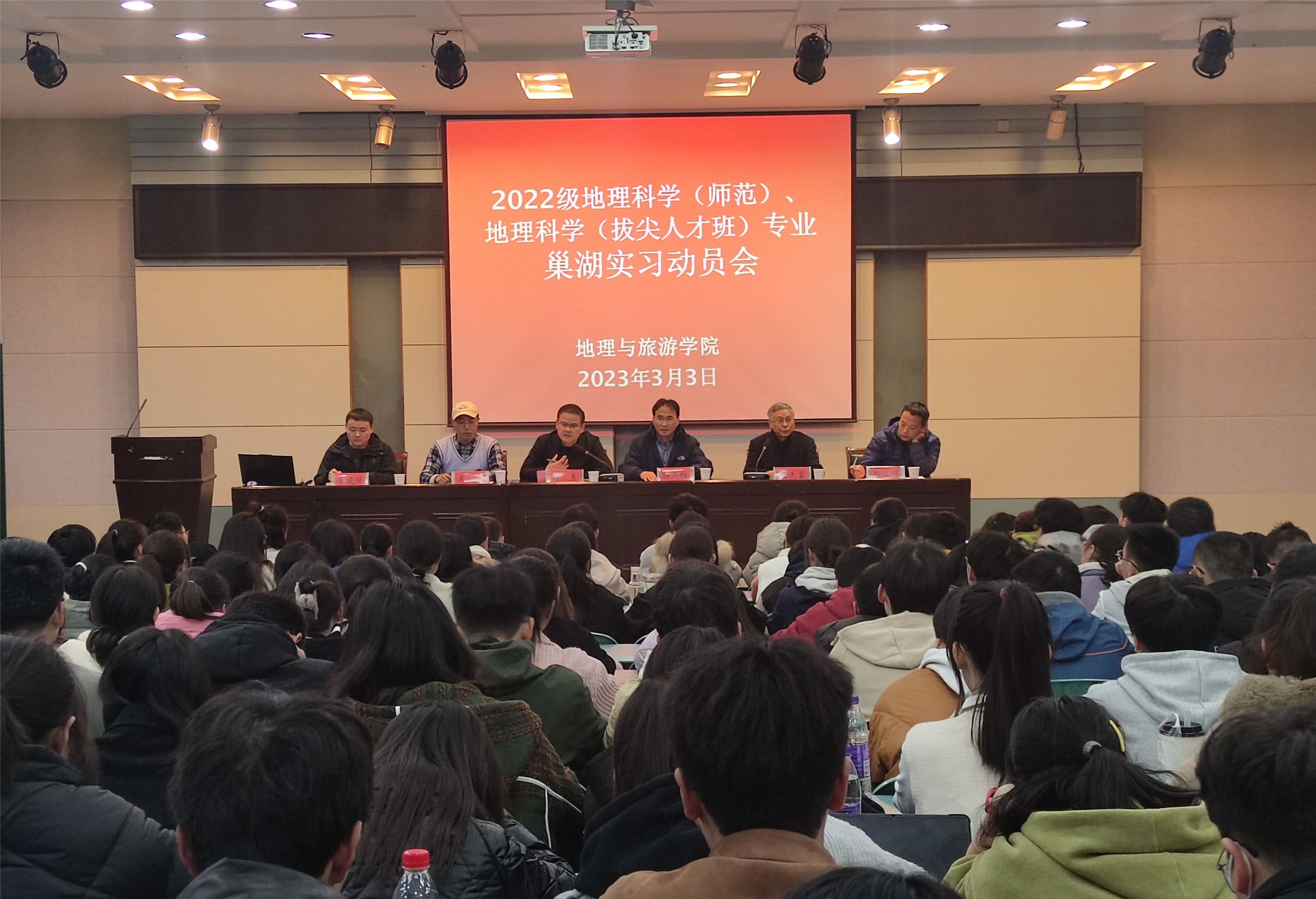 召开2022级地理科学(师范)、地理科学(拔尖人才班)专业巢湖实习动员大会,学院党委副书记付勇,副院长杨兴柱,实习指导老师程先富、吴立、杨立辉、朱晓强以及辅导员陈祥云、操晶晶出席会议,2022级地理科学(师范)、地理科学(拔尖人才班)专业全体学生参加会议,会议由程先富教授主持。