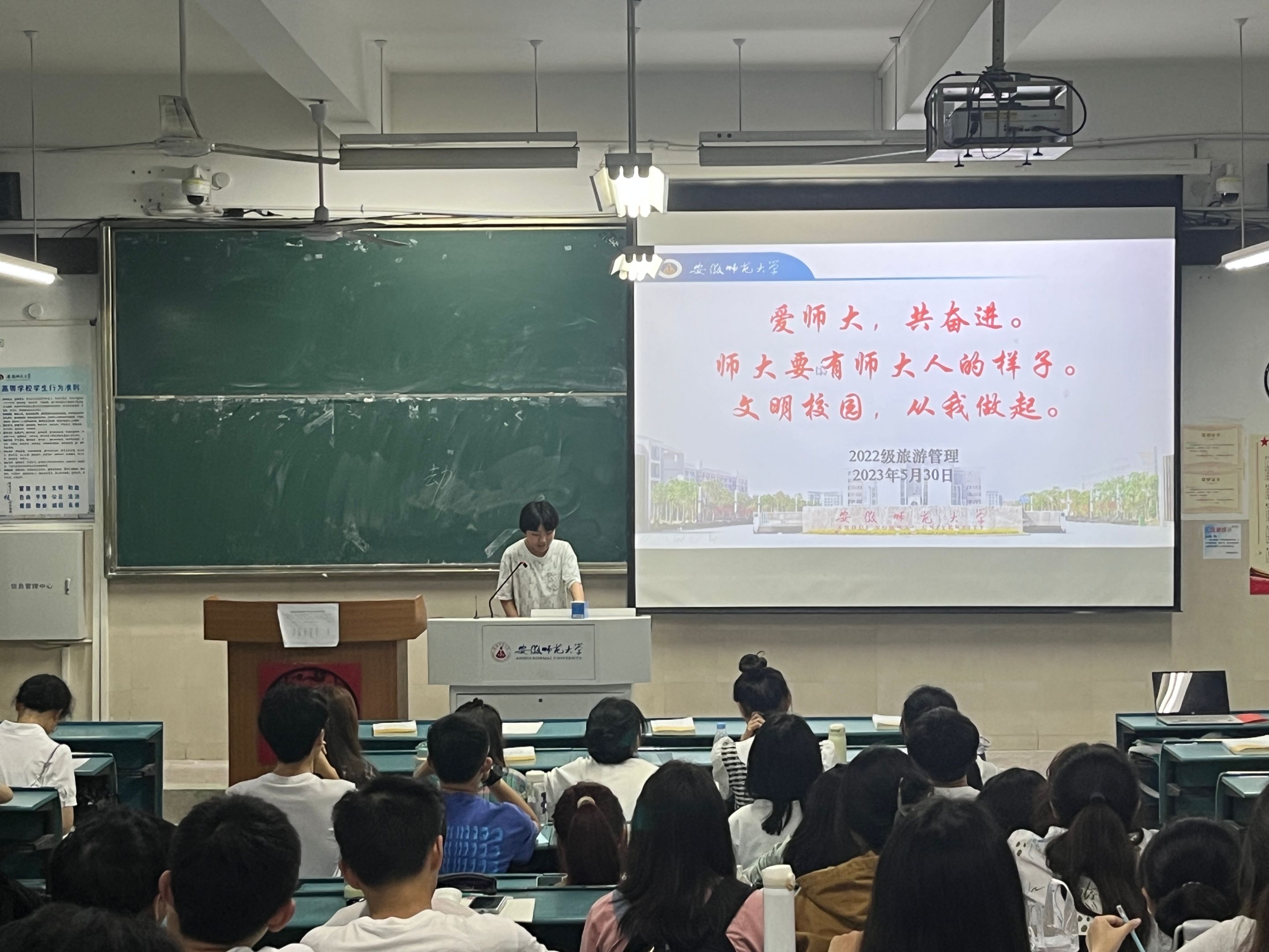本网讯(周婷婷,谢园)为推进资助育人工作,培养学生知恩感恩、勇于担当的良好品质,2023年5月30日,2022级旅游管理专业全体同学于行知楼4号楼102教室开展“践行诚实守信 争做时代新人”资助诚信教育暨“六个文明”教育主题班会,班会由辅导员谢园老师主持。