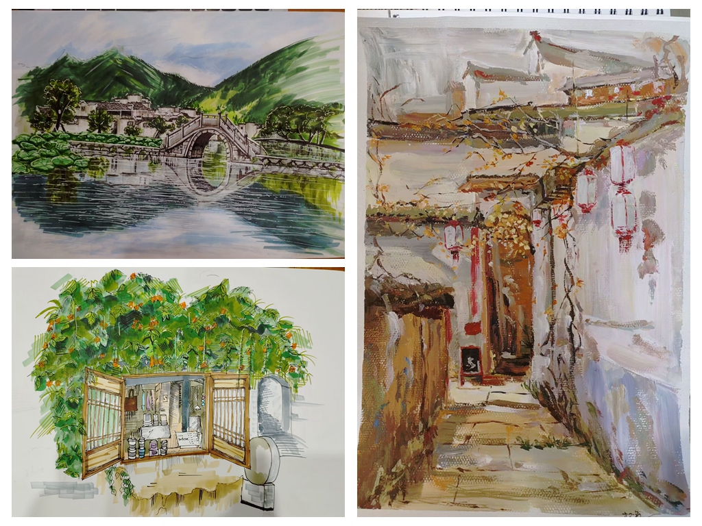 青山绿水引诗赋,墨瓦白墙牵画魂。在为期10天的实习过程中,老师还带领同学们去到了西递、屯溪老街、秀里风景区进行实地考察与写生。通过不同村落形态及布局的对比,深入思考徽派建筑的异同,在提高绘画能力的基础上提升专业素养。