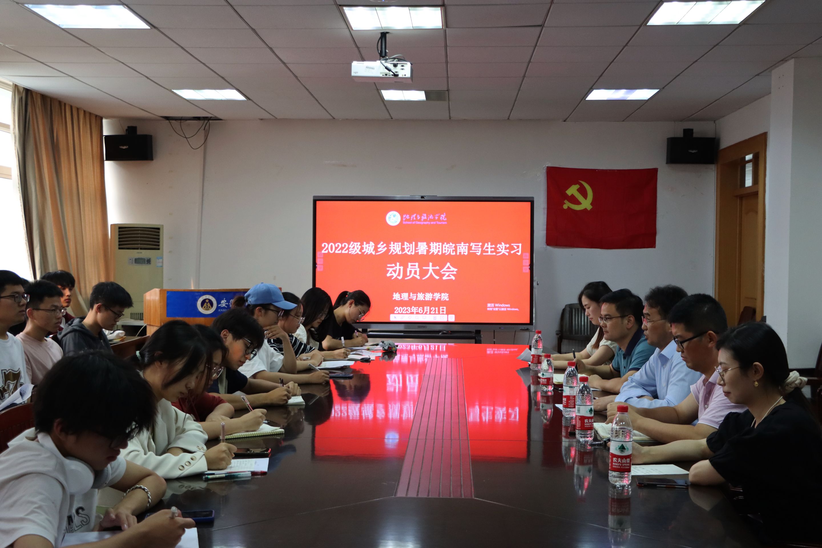 在行政楼三楼会议室召开2022级城乡规划暑期皖南写生实习动员大会,院党委副书记付勇、副院长杨兴柱、城乡规划专业主任韩会然、城乡规划专业教师金莹莹、黄秋实、辅导员操晶晶以及2022级城乡规划全体同学参会,会议由金莹莹主持。