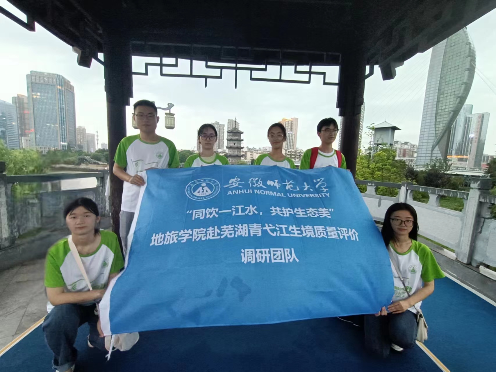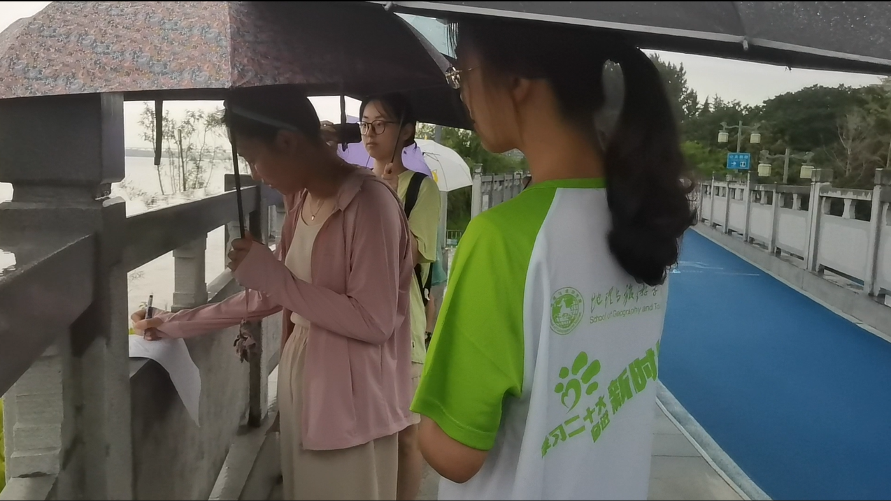 “同饮一江水,共护生态美”调研团队赴芜湖市青弋江流域进行河流生境质量评价及其影响因素分析。团队成员通过发放问卷的形式,调查水质改善对当地旅游业的带动效应以及对当地居民生活的影响。