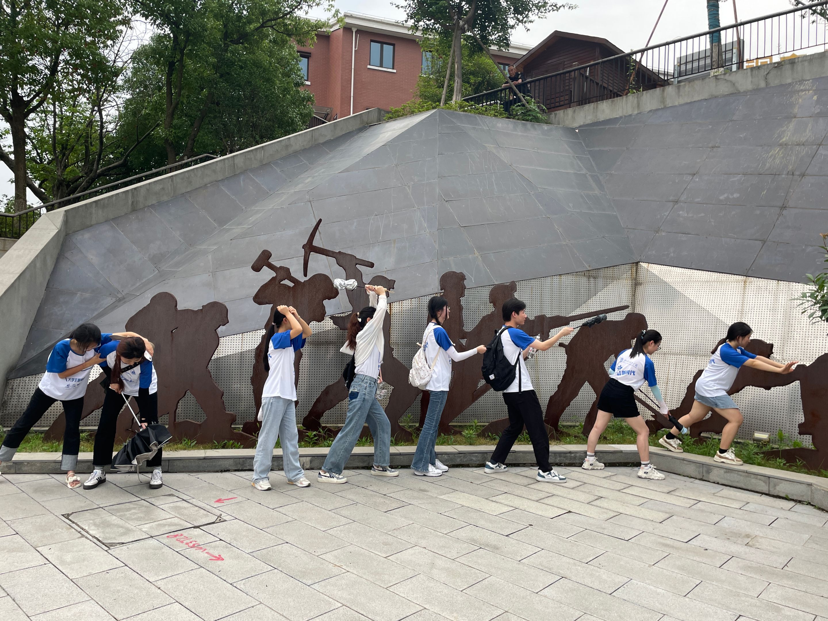 “游客行为艺术”作为主线始终贯穿着本次调研实践的全过程。在文创园调研期间,杨效忠教授致力于引导每一位本团队的成员体会何为“游客行为艺术”,如何展示“游客行为艺术”。首先,看到板墙上展示的林林总总的“铜陵方言”,他建议并积极引导同学们以说唱的形式展示、体会方言的魅力,他言:“这就是行为艺术的一种表达方式,我们要让静态的雕塑展示、板墙宣传展示动态化,以游客的视角使其更具表现力、感染力。”此外,他还支持同学们演绎矿工们开采铜矿的动作、行为等,教授的指点让不少同学对于“游客行为艺术”这一抽象概念有了具象化的理解与感悟。一名队员说道:“在表演中,我们共同探讨,有说有笑,乐趣无限,感触颇深;于尝试与实践中,我们也对‘游客行为艺术’有了一定的思考方向,这对我们此次课题的铜文化研究、文化创意等帮助极大。”
