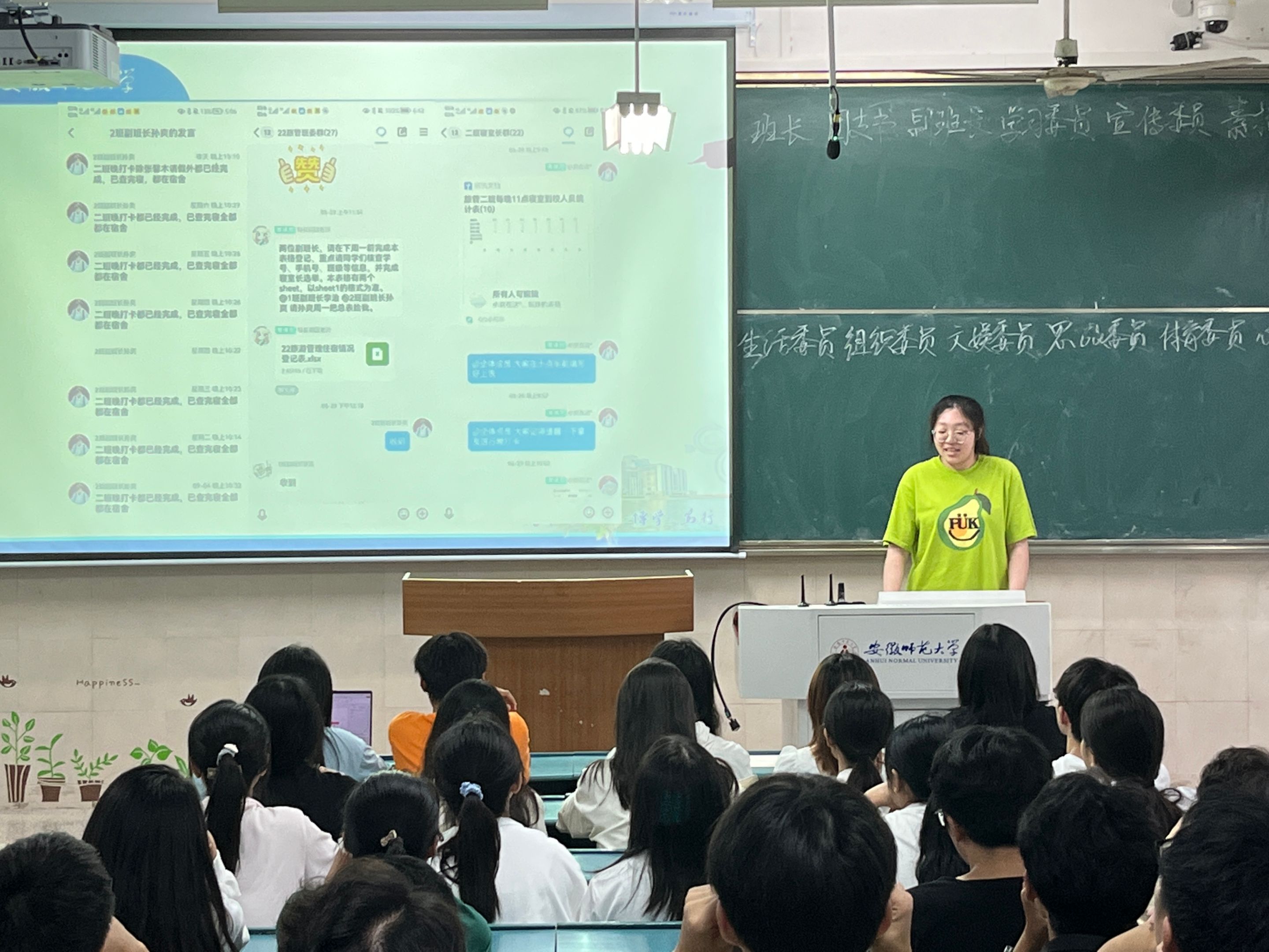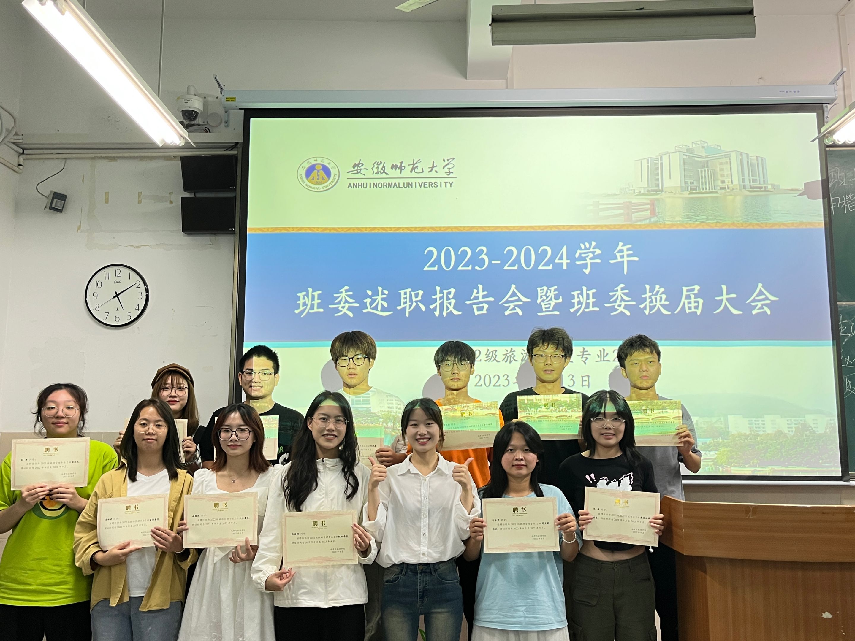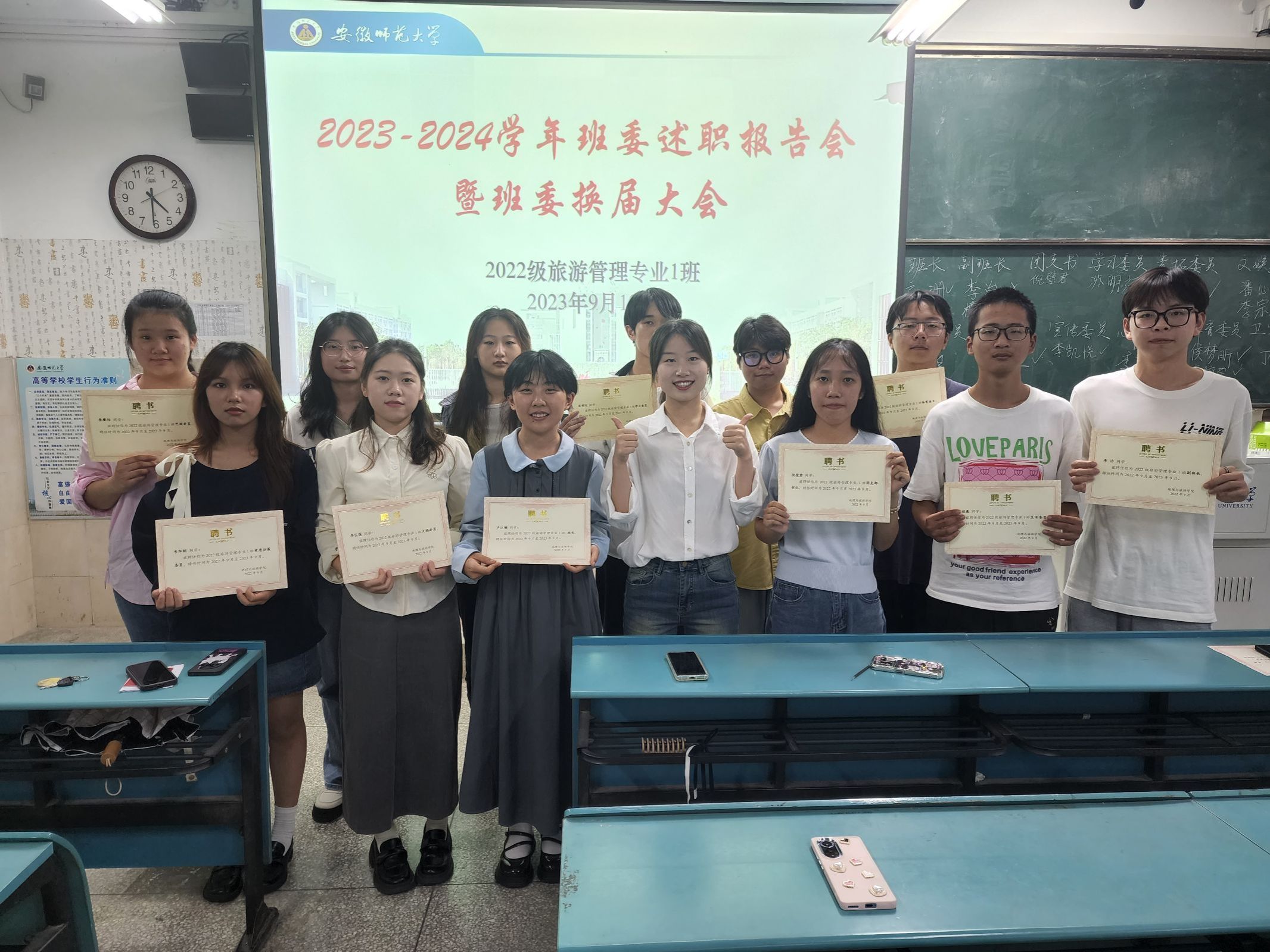 周婷婷)展望未来谱新篇,不忘初心重传承,2023年9月13日下午三点,2022级旅游管理专业2023-2024学年班委述职报告会暨班委换届大会分别于行知楼2040101、2040103教室举行,会议两位班长主持,辅导员谢园和全体同学参加。