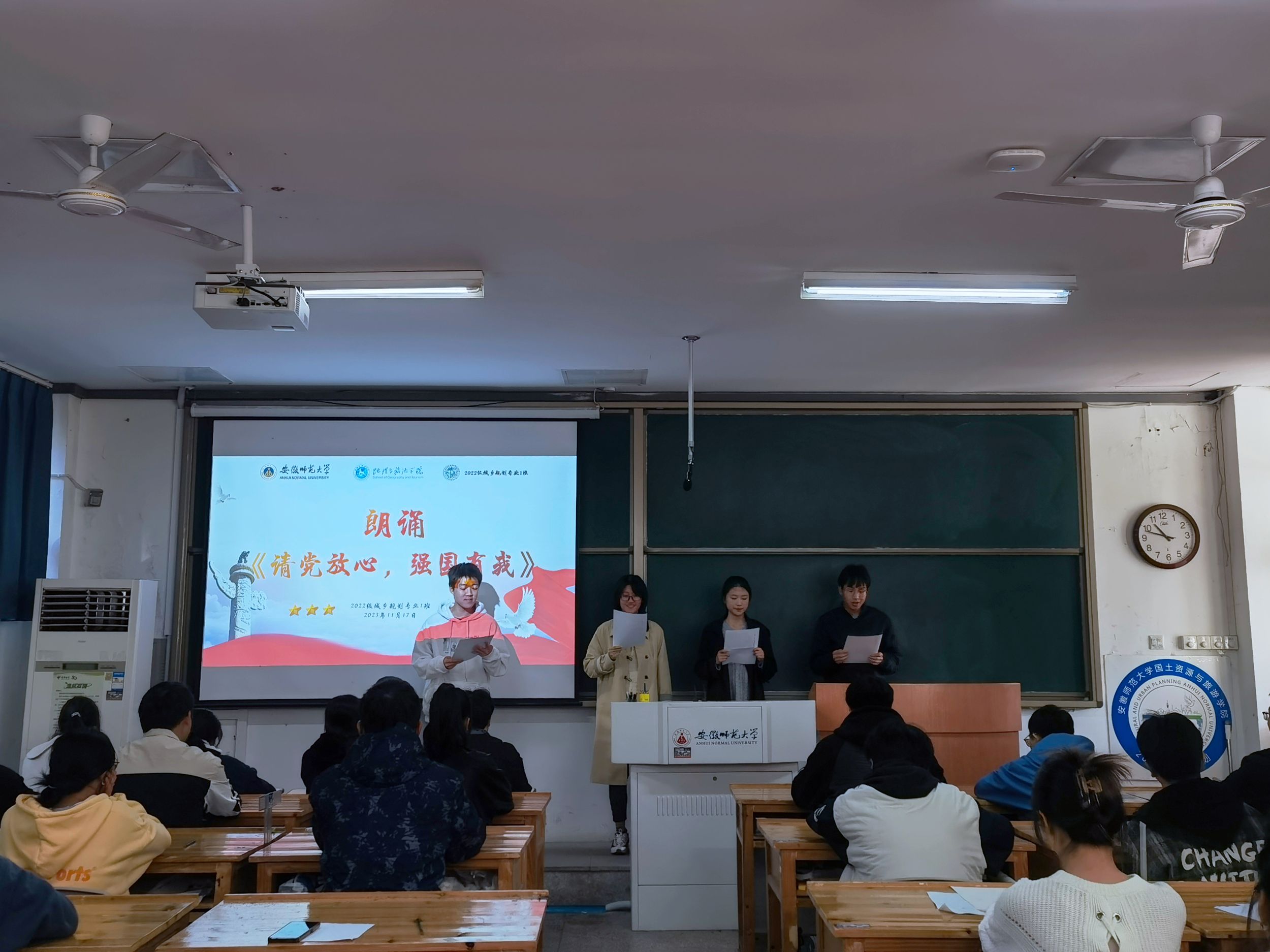 “吾有所爱,其名华夏”。王莫楠、刘京川、程基昱、陈秋怡四位同学朗诵《请党放心,强国有我》,他们用铿锵有力的话语喊出刻在骨子里的坚定,用掷地有声的誓言喊出融在骨血里的傲气。
