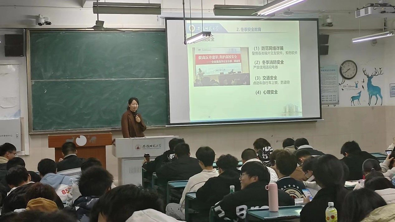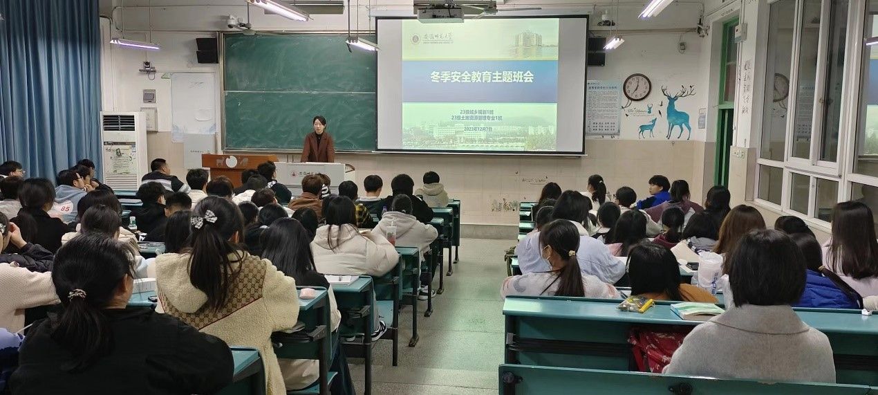 花津校区4号楼202教室召开本科生冬季安全教育主题班会,2023级土地资源管理1班、2023级城乡规划1班全体同学到场参加。