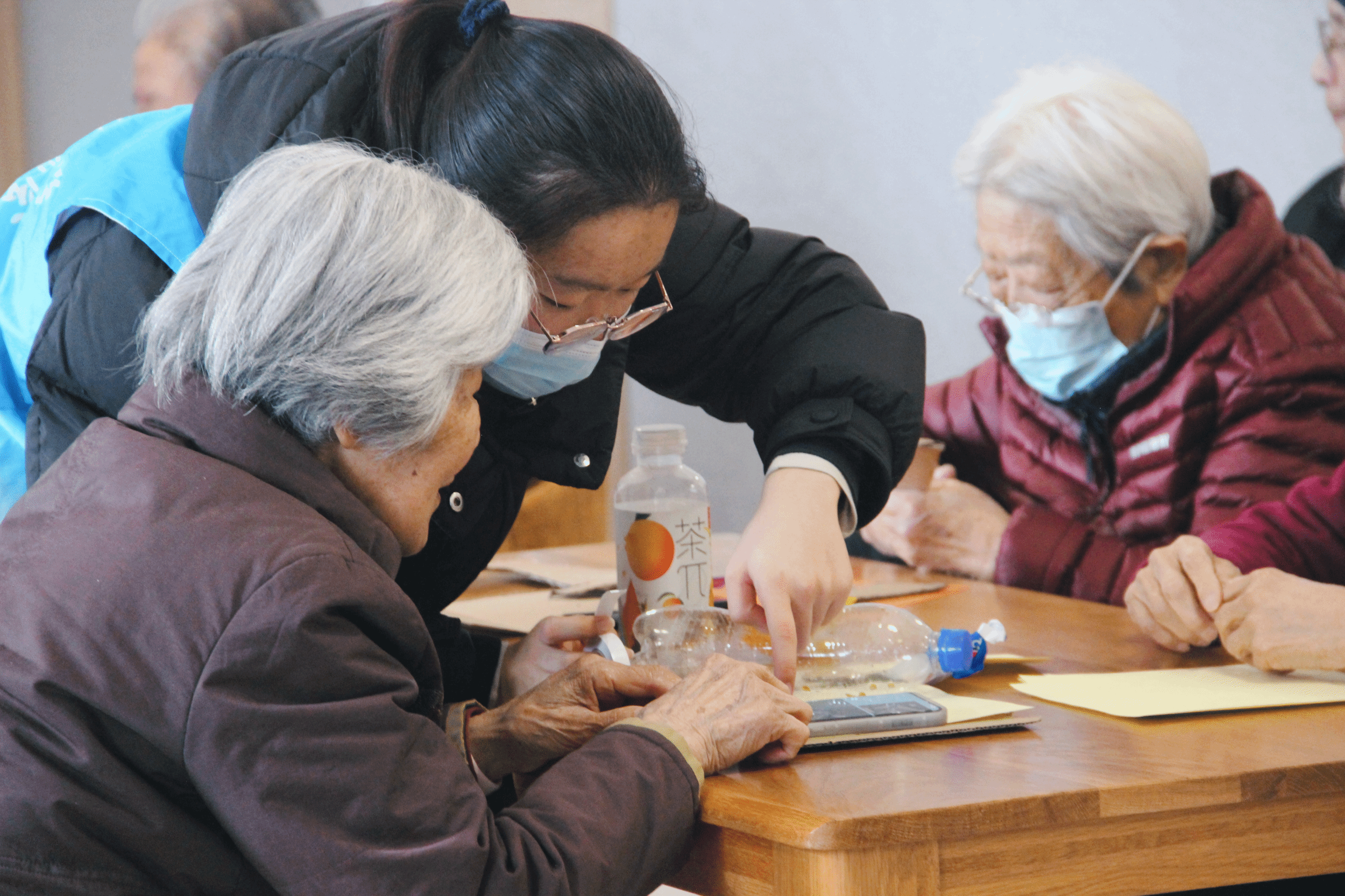 图为志愿者与老人做手工。