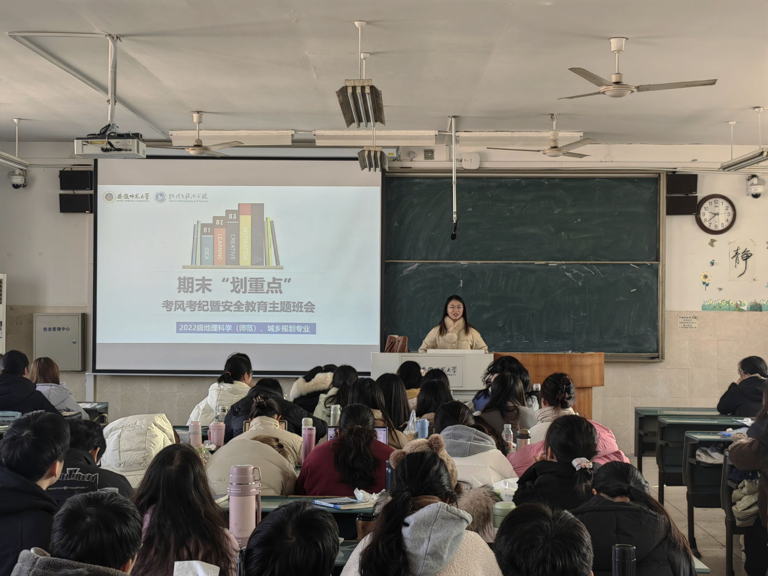 “大学生护航”行动计划,增强同学们的安全意识、营造诚信考试的良好氛围,12月20-22日,2022级城乡规划、地理科学(师范)专业分别于2040301A、2040607、2060401教室召开“期末‘划重点’暨考风考纪及安全教育”主题班会。班会由辅导员操晶晶主持,全体同学参加。