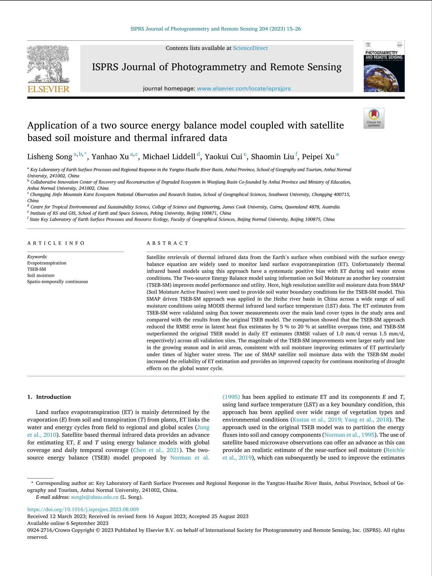 【科研硕果】Application of a two source energy balance model coupled with satellite based soil moisture and thermal infrared data