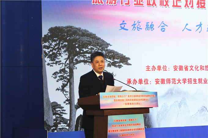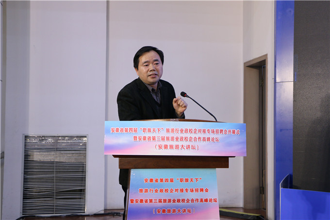 陆林在发言中表示,学校历来高度重视毕业生就业工作,充分肯定了“职旅天下”系列活动的重要意义,认为该项品牌活动已成为一个集“就业招聘+专业建设+行业发展+人才培养”四位一体的协同合作创新平台,希望参会政校企嘉宾朋友依托平台充分交流,共同合作,将行业发展与人才建设相结合,将理论与实践相结合,共同为美好安徽和旅游强省建设发挥重要推动作用。