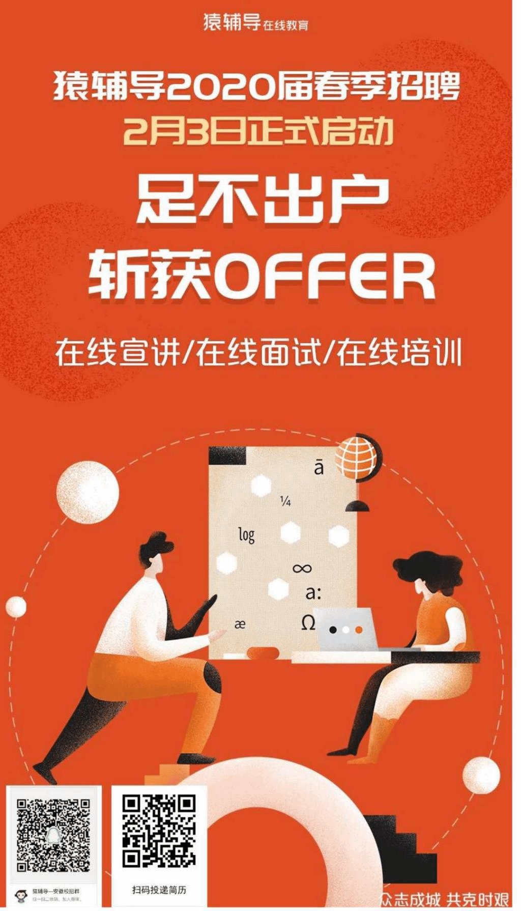 猿辅导公司是国内领先的K12在线教育互联网公司,截止2018年,已完成E+轮(3亿美金)融资,是首个估值超过30亿美元独角兽企业。旗下拥有猿辅导 猿题库小猿搜题及斑马系列产品,粉笔公考等兄弟产品。