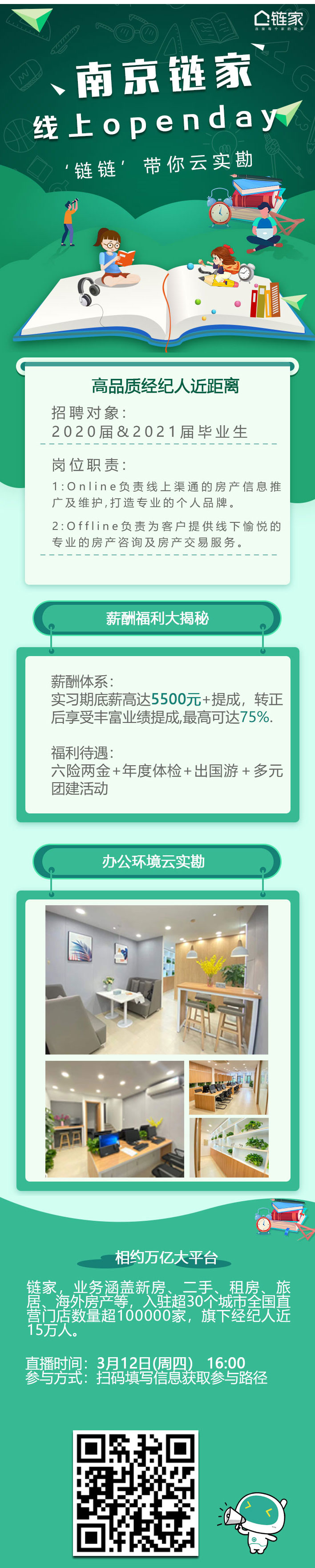本周新推:南京链家线上openday[NoProb]门店近距离,直击工作环境同事面对面,空中深度对话直播时间:3月12日下午4点,我们不见不散空宣流程:戳图扫码填写信息,获取参与路径联系人:郑菊联系方式:15251714082(微信同号)同学入职成功更有1000京东卡激励咯